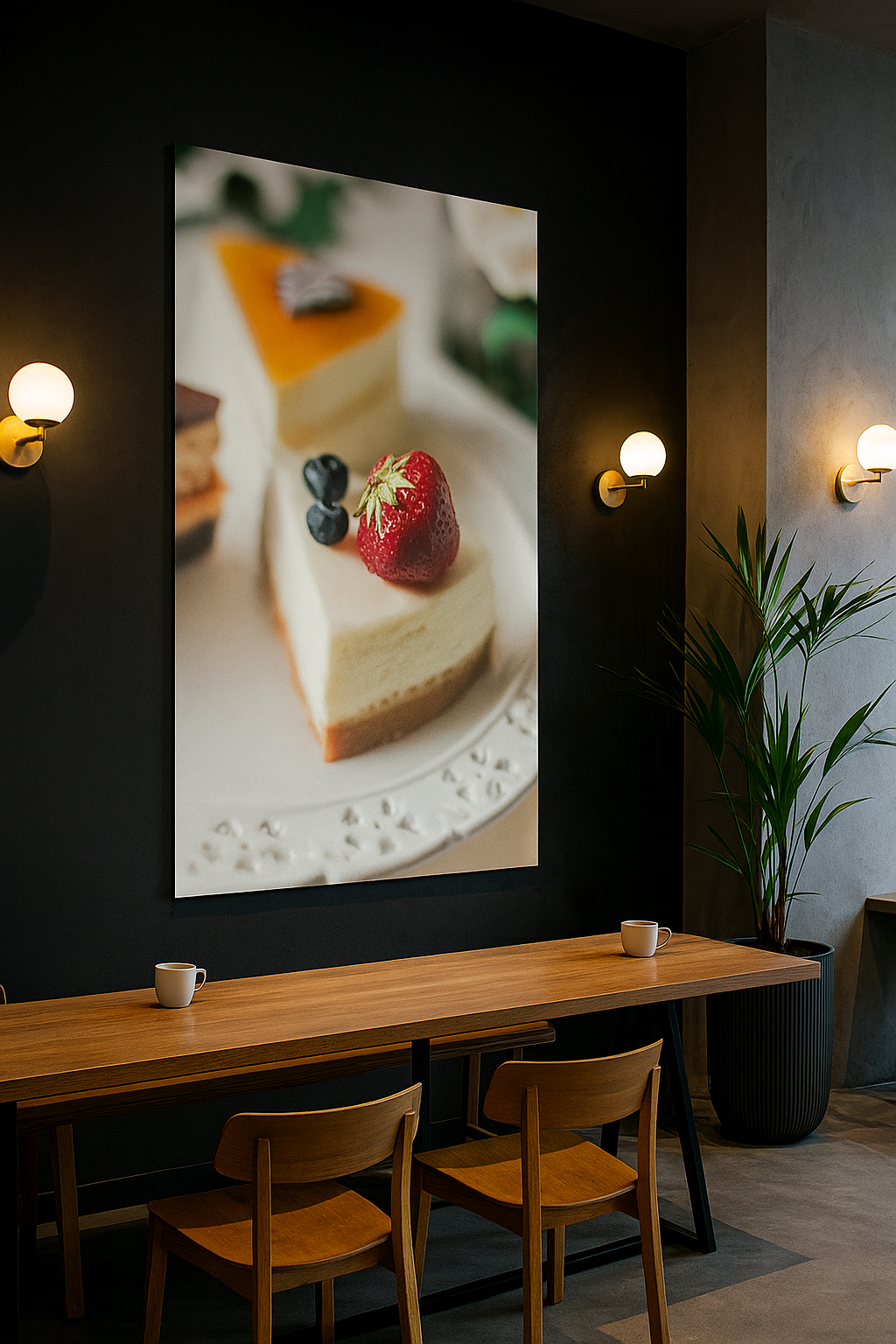 Transform your retail space with this captivating wall painting featuring a delectable piece of cake. This artistic composition brings warmth and visual interest to any storefront, creating an inviting atmosphere that resonates with customers. The expertly rendered imagery combines culinary appeal with fine art aesthetics, making it an ideal choice for bakeries, cafés, or boutiques seeking to enhance their interior design. A sophisticated statement piece that elevates your brand's ambiance while celebrating the artistry of craftsmanship.