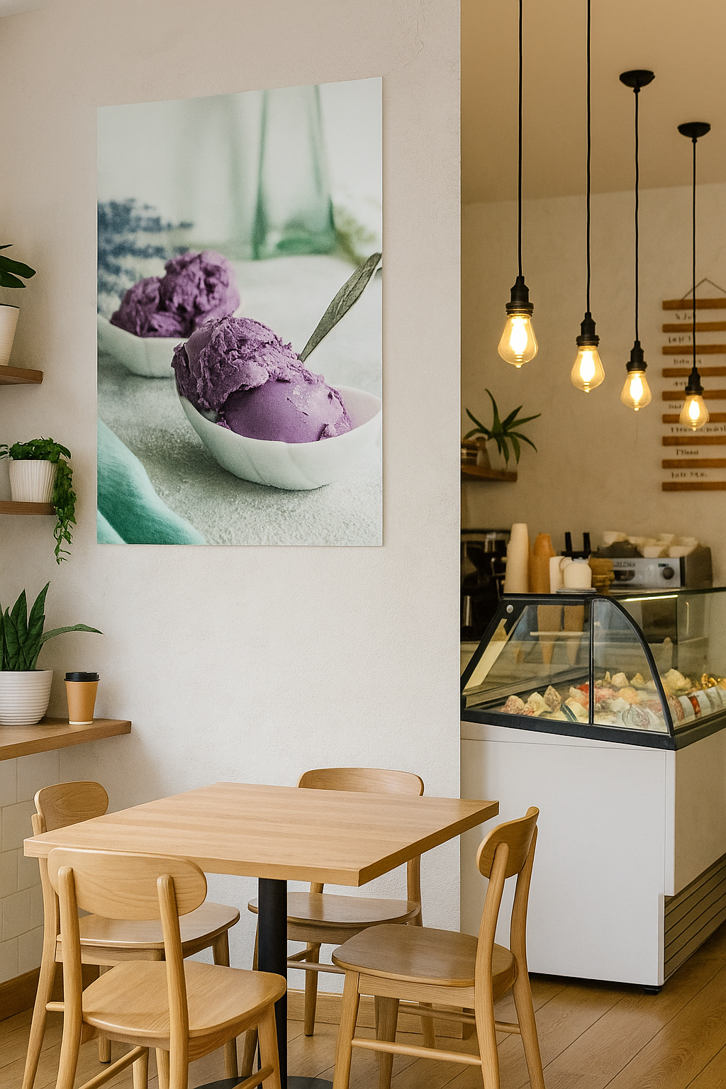 Ice Cream Elevate your store's aesthetic with this striking purple ice cream wall art. A vibrant, eye-catching piece that brings playful sophistication to any retail space. Perfect for ice cream shops, dessert cafés, or modern commercial interiors seeking a bold visual statement. This professionally curated artwork captures the indulgent appeal of frozen treats while adding contemporary flair to your walls. An ideal choice for merchants looking to reinforce brand identity and create an inviting atmosphere that resonates with customers seeking premium confectionery experiences.